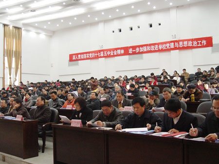 学校党委书记赵艳林,党委副书记、校长张学洪,党委副书记、纪委书记赵君,党委副书记王赣华,党委委员、副校长陈学军、吴志强,党委委员、校长助理、人事处处长华桂林,党委委员、组织部部长陈贵英出席会议。周国清副校长列席会议。学校党委职能部门、工会和团委副科级及以上干部,研究生处、教务处、科技处、招生就业处负责人,各二级党组织书记、副书记、委员,各党支部书记(含学生支部书记),各二级学院团委书记和学工组组长、思想政治理论教学部领导班子成员等参加会议。
