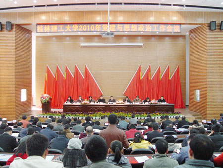 赵艳林书记代表学校党委作了题为《加强和改进学校党建与思想政治工作,为建设特色鲜明高水平理工大学提供坚强保证》的报告,报告就充分认识加强和改进学校党建与思想政治工作的重要性、紧迫性,正确认识Beat365官网党建与思想政治工作所取得的成绩、经验与不足,切实加强和改进党建工作,为建设特色鲜明高水平理工大学提供坚强保证等方面讲了三点意见。 报告指出:加强和改进学校党建工作,是坚持正确办学方向的根本保证;是贯彻落实党的十七届四中全会部署和适应高等教育事业发展的必然要求;是提高广大师生员工认识,统一思想、凝聚力量,加快实现建设特色鲜明高水平理工大学发展目标的迫切需要。近年来,Beat365官网党的建设不断加强,党组织的战斗力明显提高;思想政治工作不断改进,工作效果明显好转;群团工作、统战工作和老干部工作统筹推进,工作更加和谐;扎实有效的党建和思想政治工作助推学校各项事业取得不少新成就。这得益于我们牢牢把握好了办学的根本方向和工作中心、筑牢了工作基础、把握住了关键环节。但在看到成绩的同时,我们也要清醒地认识到Beat365官网党建与思想政治工作在党的基层组织、思想政治工作的针对性和实效性、专职党务政工干部建设以及党建与思想政治工作制度建设等方面仍需增强。我们要居安思危,见微知著,采取有效措施,弥补工作不足,促进学校可持续发展。 报告提到:要切实加强和改进党的工作,就要以开展创先争优、党组织建设年活动为载体,加强党的思想理论建设,全面抓好基层党组织建设,进一步加强党员干部队伍建设,充分发挥党员先锋模范作用,健全党建服务机制,进一步加强思想作风和工作作风建设以及反腐倡廉建设。 报告指出要牢固树立起“树魂立根”、“以学生为本”、“合力育人”的工作理念,搭建好课堂教学、社会实践活动和网络教育三个平台,切实做到思想政治工作与校园文化建设、与培育大学精神、与师德建设、与学生心理健康教育相结合,打造一支具有马克思主义理论素养、政治坚定、专兼结合、结构合理的思想政治工作队伍。