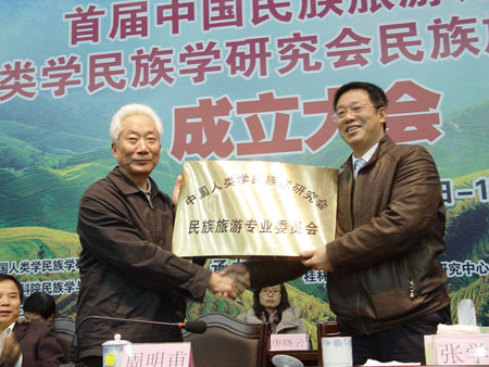 周明甫副主任(左)与张学洪校长(右)共同为中国人类学民族研究会民族旅游专业委员会成立揭牌