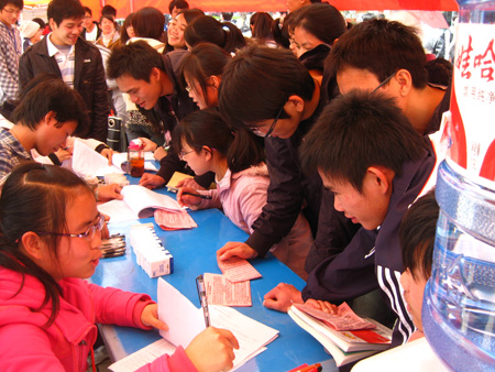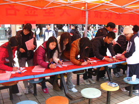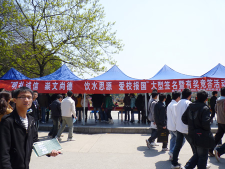 在活动现场,“明礼诚信崇文尚德 饮水思源爱校报国”的巨大红色条幅分外醒目,吸引了广大师生驻足观看,同学们纷纷在横幅上郑重写下自己的名字。签名后,同学们又围在竞答题目展板前讨论交流,抽选自己得心应手的题目进行竞答,答对的同学即可从兑奖处领到水性笔、洗衣粉、纸巾等各种小奖品。活动持续了近8个小时,同学们参与热情极高,活动现场气氛热烈。同学们普遍认为用有奖竞答的方式宣传学生资助政策,形式灵活新颖,让人耳目一新,通过活动不仅进一步认识和了解了高校学生资助政策,而且更加强化了自身的责任意识和感恩意识,真正体现了寓教于乐。此次活动是Beat365官网目前正在开展的2011年“学生资助政策宣传月”中面向全校学生举行的一项重要活动。