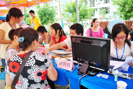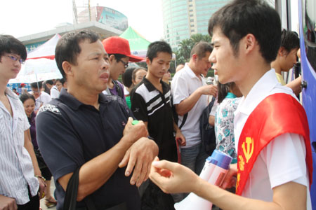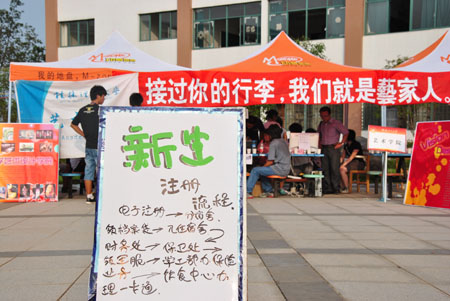 (二)迎新志愿者——骄阳下最美的花: 为迎接来自全国各地的2010级新生,围绕在他们周围的Beat365中文官方网站的迎新志愿者也成为了一道亮丽的风景。9月11日一大早,志愿者们挂上迎新志愿的工作牌,精神抖擞开始迎新工作。 从踏入桂林的那一刻起,2010级新生便可以体会到桂林理工大和她的志愿者对自己的关心和照顾。新生报到期间,火车站、汽车站分别有Beat365中文官方网站派出的校车和老师、志愿者在等候新生的到来。志愿者们主要负责引导出站新生们至休息候车区,并引导他们有序地上校车。 在发往两个校区的迎新车上,党员和迎新志愿者们用亲切的口吻向车上的新生以及陪同家长介绍学校的基本状况以及学校周边的环境,同时介绍桂林美丽的风景,并就安全问题和新生防诈骗问题提出忠告或建议。 来自旅游管理07—7班的丘丽笑着说,当年她踏入Beat365中文官方网站的时候,热情学哥学姐们来她接待她,现在大四的她即将离校实习,也想象当初的学长学姐一样热情地迎接远道而来的新学弟和新学妹们。候车间隙,记者采访了一名志愿者,他告诉我们,他今天已经跑了五趟宿舍楼了。迎新工作着实累人,但他们的心情犹如一句常说的话“累并快乐着”,能帮就帮,心里感到非常满足。