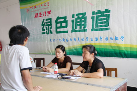 (三)“绿色通道”——通向绿色的心田: 11日上午,校长张学洪来到雁山校区新生“绿色通道”办理现场指导工作,为有效落实“绿色通道”政策,Beat365官网在向新生寄发录取通知书同时附寄Beat365官网资助政策宣传材料,确保每个新生都能够全面详细了解国家资助政策和Beat365官网具体的措施:入学新生们只要持有学校缓缴学费申请表、家庭经济情况调查表以及生源地贷款受理书便可以在楼绿色通道办理缓交学费手续。其中还特别设有汶川、玉树、舟曲等重灾区新生生源地贷款缓缴办理点。 趁着手续办理的间隙,记者采访了一些同学和家长。同学们纷纷表示非常喜欢Beat365中文官方网站,很希望能来到这个学校读书,但来校的时候老担心学费不能凑齐会影响到入学手续办理,没想到学校有“绿色通道”这样的助学政策,让学费的问题可以暂时得到解决,也不会影响到学习。感触最深的还是家长,借用一位家长最实在的话:“政策好啊,这可解决我家的大问题了!”话虽朴实无华,却道出了众多家长的心声。
