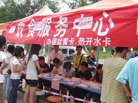 (四)勤工助学、后勤集团细致服务: 学校勤工助学办公室为配合学校的迎新工作,在新生报到注册之前购置了大量床上用品、洗漱用品等,在雁山校区男生10栋和及女生4栋宿舍楼前面设立生活用品销售点,工作人员全天三班倒,每班安排35名工作人员热情为新生服务。考虑到会有新生深夜到校,勤工助学办公室还特别安排助理通宵值班,方便深夜到校的新生也能及时买到各种生活必须用品,给长途颠簸的新生以及家长提供贴心周到的服务。后勤集团还在雁山校区5C男生公寓设置50张临时床位,以备晚10点后到校的送行家长夜间临时住宿之需。