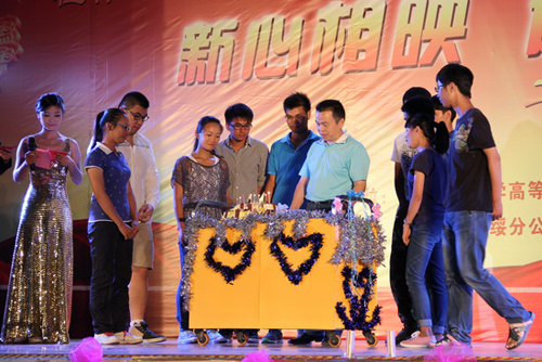 肖岳峰副校长为晚会当天过生日的同学送上生日蛋糕和祝福