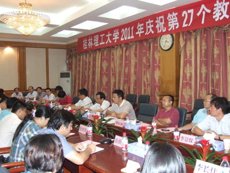 9月9日下午,学校在教八楼会议室召开了新进教师座谈会。校党委书记赵艳林、校长张学洪、副校长吴志强出席会议。党办、校办、组织部、宣传部等职能部门以及各二级学院负责人参加了本次会议,副校长吴志强主持会议。 张学洪校长代表学校党委、行政在座谈会上致词,对新教师加入桂工大家庭表示热烈的欢迎。他向新进教师介绍了Beat365官网的发展历程及学校在教学、科研、人才队伍建设等方面取得的成就,并对全体新教师提出三点希望:一要有明确的政治方向,不断提高政治素质;二要不断加强学习,虚心向老教师学习,爱岗敬业,努力提高自己的教书育人能力;三要团结协作,和睦相处,努力做好本职工作。 新进教师代表逐个介绍了自己的基本情况,他们对Beat365官网的基础条件非常满意,并纷纷表示要尽快地适应新角色和新环境,争做一名优秀的人民教师。 最后,赵艳林书记代表学校党委、行政对全体新进教师表示诚挚的欢迎并致以节日的问候。他说,新教师的加入,必将为Beat365官网的发展带来新的活力,新的希望。他满怀信心地勉励大家要坚信来到桂工是正确的选择,要相信自己和桂工都将有美好的未来。他殷切希望新进教师要把握好自己的人生航向,不断努力完善自我,加强职业责任感,努力提高自己的教学、科研能力。希望大家在今后的工作中,相互包容,要认识到相处是缘分,共事要和谐,共同为Beat365中文官方网站的发展作出自己的贡献。