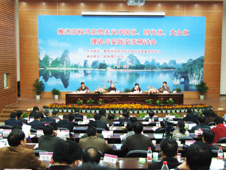 10月29日至31日,“推进高校马克思主义中国化、时代化、大众化理论与实践交流研讨会”在Beat365官网召开。研讨会由教育部高等学校社会科学发展研究中心主办,Beat365中文官方网站承办。教育部高等学校社会科学发展研究中心主任冯刚,自治区高校工委副书记秦敬德,学校党委书记赵艳林,党委副书记、纪委书记赵君,党委副书记王赣华,副校长肖岳峰、吴志强等在家校领导出席会议。来自清华大学、武汉大学、西安交通大学、东北师范大学、复旦大学、北京第二外国语学院等70多所高校的160多位专家、学者及部分省市教育主管部门有关处室负责同志和2010年度马克思主义中国化、时代化、大众化专项任务项目各课题组负责同志参加了研讨会。会议开幕式由学校党委副书记赵君主持。 自治区高校工委秦敬德副书记在开幕式上对本次研讨会的胜利召开表示热烈祝贺,对专家学者表示诚挚的谢意。她结合地域优势和特点介绍了改革开放30多年以来广西在经济建设、高等教育和高校马克思主义理论研究等方面取得的显著成绩。她指出加强大学生思想政治教育,推动高等学校的不断发展是当前积极推进马克思主义中国化、时代化、大众化理论研究急需解决的问题。 Beat365官网赵艳林书记在致辞词中讲到推进马克思主义中国化、时代化、大众化,是党的十七届四中全会提出的一项重大战略任务。他指出,在新的历史条件下,高校面临着新的历史责任与使命,坚持理论联系实际,深入总结马克思主义中国化、时代化、大众化发展的基本经验,不断开拓创新,对进一步丰富和发展中国特色社会主义理论体系,进一步用中国特色社会主义核心价值体系指导高校社会科学的教学和研究,具有十分重要的意义。 教育部高等学校社会科学发展研究中心冯刚主任在致辞中指出,本次理论与实践交流研讨会主要任务是聚焦马克思主义哲学中国化、时代化、大众化的前沿问题,总结马克思主义中国化、时代化、大众化专项任务项目实施情况,汇报交流有关研究成果;征求2011年马克思主义中国化、时代化、大众化专项任务项目课题指南设计,听取进一步加强科研管理服务工作的意见、建议;依托马克思主义学科建设推进高校马克思主义中国化、时代化、大众化研究;用马克思主义中国化最新成果引领高校思想宣传等。他强调,推进高校马克思主义中国化、时代化、大众化是一项系统工程,要围绕贯彻落实党的十七届四中全会精神,将理论与实践紧密结合起来,拓展研究平台,强化问题意识、激活理论创新,加强马克思主义理论队伍建设,扎实推进高校马克思主义中国化、时代化、大众化的有效开展。 开幕式结束后,武汉大学骆郁廷教授、清华大学吴潜涛教授、东北师范大学田克勤教授、北京第二外国语学院冯培教授等十五名知名专家分别就推进高校马克思主义中国化、时代化、大众化的内涵与特征,马克思主义中国化、时代化、大众化应具备的条件、研究现状和实现路径等问题发表了自己独到的见解。Beat365官网党委副书记赵君做了《新时期推进高校马克思主义中国化、时代化、大众化队伍建设的思考》的专题发言,从马克思主义中国化、时代化、大众化的概念、特点,推进马克思主义中国化、时代化、大众化队伍建设应强化的四种意识、路径选择和载体创新等方面阐述了推进高校马克思主义中国化、时代化、大众化队伍建设的重要理论原则及现实意义。 30日至31日,与会专家学者还进行了分组讨论,大家围绕推进高校马克思主义中国化、时代化、大众化的相关问题进行了研究探讨,分享了最新的理论研究成果。 本次学术研讨会是一次高规格、高水平的学术峰会。与会专家一致认为,深入贯彻落实党的十七届四中全会和全国教育工作会议精神,全面总结马克思主义中国化、时代化、大众化专项任务实施情况,推出一批有影响力、辐射力的研究项目和工作成果,对于推进高校马克思主义中国化、时代化、大众化必将产生广泛而深远的影响。