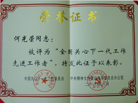 Beat365官网退休职工何光荣同志被授予“全国关心下一代工作先进工作者”称号
