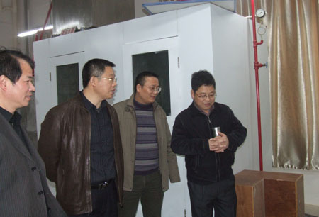 张学洪校长(右三)、吴志强副校长(右一)在查看实验室设备