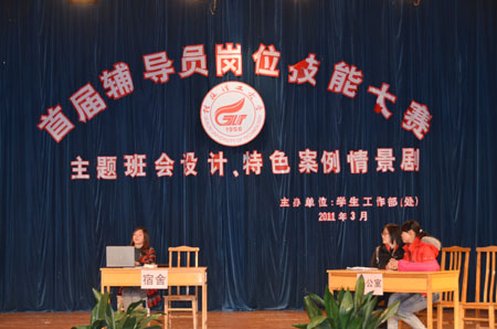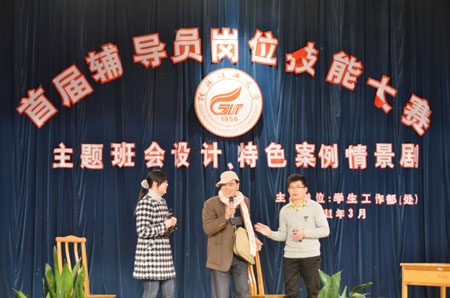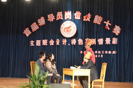 本次辅导员岗位技能大赛分为主题班会设计、特色案例情景剧、辨认学生比赛和日常管理基本知识竞赛四个主题。此次参赛的是“主题班会设计与特色案例情景剧” 两个部分,共有来自学工处、校团委和各学院近50名学工人员参赛。经过激烈的角逐后,主题班会《感恩》因设计新颖、贴近学生、可操作性强获得该主题的一等奖,并夺得“最佳创意奖”; 特色案例情景剧《梦想飞扬》因剧情贴近学生生活,内容丰富,立意深刻获得该主题的一等奖;特色案例情景剧《迷失》夺得最佳表现奖。 本次比赛较好地展现了Beat365官网辅导员们的精神面貌和学工人员的专业特点和职业特长。辅导员们真情演绎的情景剧也体现出了Beat365官网学生工作方法和思路上的开拓创新,对今后处理类似学生工作具有较好的参考和借鉴意义。