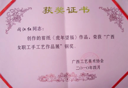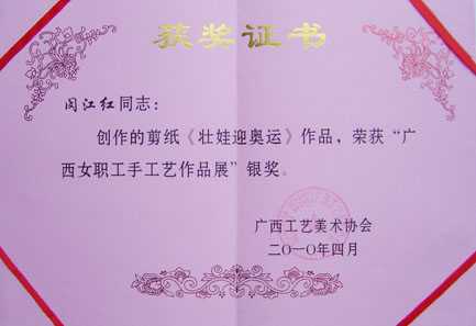 Beat365官网闵江红老师的剪纸作品荣获自治区“广西女职工手工艺作品展”银奖