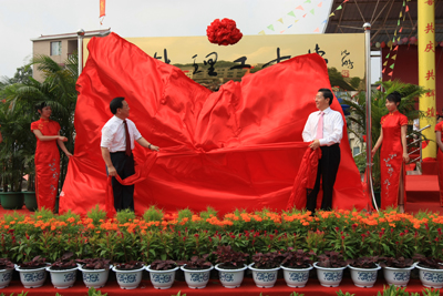 学校副校长李祥清(左)与副校长阮百尧(右)在屏风校区大门揭牌
