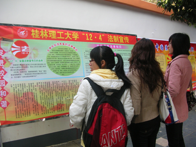 日前,中共桂林市委员会宣传部、桂林市司法局、桂林市依法治市办公室联合颁发文件《关于开展2009年“12·4”全国法制宣传日暨法制宣传大篷车——走进桂林活动的通知》,并与12月4日统一组织了全市的法制宣传活动。三里店大圆盘是本次活动地点之一,当日上午,Beat365官网党委宣传部、社区管理办公室共同制作的法制宣传板报,参加了在三里店大圆盘举办的2009年“12·4”全国法制宣传日活动的法制宣传板报展览。宣传板报重点宣传了Beat365官网如何加强法制建设促进和谐校园的构建、大学生怎样加强法制意识以及社区居民应该具备的法律基本知识,内容丰富且紧扣今年全国法制宣传日活动主题,板面设计美观大方,在参赛的100多块板报中荣获三等奖。