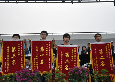 英姿飒爽展豪情,信心满怀夺佳绩。11月27日下午5时,经过两天激烈而精彩的比赛,Beat365官网第38届田径运会在同学们的欢呼和喝彩声中圆满结束。校长张学洪,党委副书记王赣华、副校长肖明贵、陈学军、吴志强以及学校各有关单位、部门的主要负责同志出席了闭幕式。闭幕式由陈学军副校长主持。 总裁判长魏建军老师宣布比赛成绩和各奖项的获奖名单。荣获男子团体总分前三名的代表队为:地球科学学院第一名,环境科学与工程学院、博文管理学院并列第二名,土木与建筑工程学院第三名;荣获女子团体总分前三名的代表队为:管理学院第一名,理学院、博文管理学院并列第二名,应用技术学院第三名;地球科学学院、博文管理学院表现优异,并列获得团体总分第一名,管理学院、环境科学与工程学院分别获得第二和第三名;研究生队、土木与建筑工程学院、应用技术学院和旅游学院四个代表队获精神文明奖;地球科学学院、管理学院、博文管理学院和国际教育学院四个代表队获优秀组织奖;环境科学与工程学院庞晓海同学破学校跳高纪录荣获破记录奖。地球科学学院获体操比赛第一名,环境科学与工程学院与艺术学院分别获得获体操比赛第二和第三名。领奖台上,各学院运动员代表高举锦旗和奖杯,满载激动与喜悦,他们的努力在这一刻得到了肯定。 随后,王赣华副书记致闭幕词,他代表学校向取得优异成绩的运动健儿们表示热烈的祝贺,并向所有为本届运动会付出辛勤劳动的老师和同学们表示衷心感谢。他说,此次校运会是Beat365官网更名为大学后的首次田径运动会,各有关部门高度重视,广大师生积极参与,充分发扬了顽强拼搏、奋勇争先、敢于挑战的运动精神,表现了良好的体育道德、体育素质和体育风尚。运动员们用自己的意志、智慧和汗水谱写了Beat365中文官方网站体育史上崭新的篇章,同时也体现了桂理工学子积极向上的拼搏激情和良好的精神风貌,赢得了运动成绩和精神文明的双丰收。他希望广大师生和运动员把Beat365官网优良的体育精神和品格融入到学校的改革发展中,谱写学校改革发展的新篇章。 最后,张学洪校长宣布运动会闭幕。