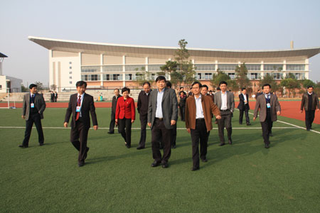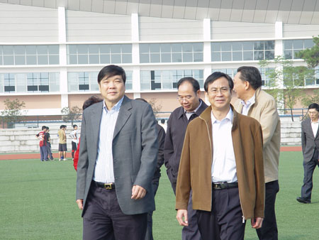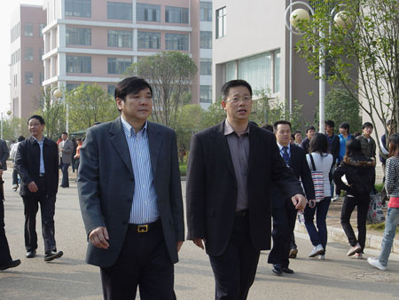 高枫厅长(左)在张学洪校长(右)的陪同下考察校风校貌