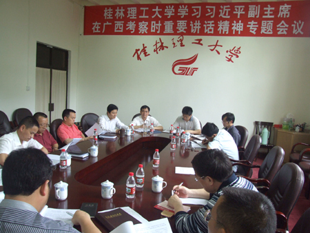 5月19日下午,学校党委中心组在校办第二会议室召开专题会议,学习贯彻习近平副主席在广西民族大学考察时重要讲话精神。学习会由赵艳林书记主持,中心组全体成员参加了学习。 与会人员一起认真学习了自治区高校工委、教育厅下发的文件《关于组织学习习近平副主席在广西民族大学考察时重要讲话精神的通知》和习近平副主席在广西民族大学考察时重要讲话内容。赵艳林书记、张学洪校长、王赣华副书记先后在会上作了主题发言。 赵艳林书记在主题发言中指出,习近平副主席的讲话充分体现了党和国家对广西高等教育的高度重视,充分体现了党中央和习近平副主席对广西广大教育工作者和青年学生的亲切关怀和殷切希望。学习贯彻好习近平副主席重要讲话精神,必须深刻领会,把思想和行动统一到讲话精神上来。进一步创新工作方式,切实加强党的建设、师德师风建设和大学生思想政治教育工作。我们要以学习习近平副主席讲话精神为动力,以建设特色鲜明的高水平理工大学为目标,加快学校教育教学改革步伐,推动学校科学发展新的跨越,办人民满意的高等教育。赵艳林书记还就如何结合Beat365官网实际,认真贯彻落实好习近平副主席重要讲话精神,提出七点要求:一是抓好学校发展规划的制定工作。要根据党代会提出的总体目标要求,认真谋划好下一步各项工作。二是加大人才引进和培养的力度,最大限度地提高人才队伍建设水平。三是以重点学科、重点实验室平台建设为龙头,以点带面,更好地推进学校学科与专业建设。四是适应时代发展要求,认真思考总结,进一步加大教育教学改革力度。五是关心、关爱学生,一切为了学生的成长着想,努力为学生的成长创造良好的条件,让家长放心、社会满意。六是确保学校的安全稳定。学校的安全稳定是做好学校一切工作的基本前提,安全稳定工作一定要常抓不懈。七是大力宣传,营造浓厚的学习氛围,在全校师生中掀起学习习近平副主席讲话精神的高潮。最后,赵艳林书记希望全校干部职工要将习近平副主席的重要讲话精神落实到日常的工作中去,为提高Beat365官网的教育教学质量,为广西高等教育的发展做出自己的贡献。 张学洪校长在主题发言中就贯彻落实习近平副主席重要讲话精神,做好Beat365官网当前主要工作进行了安排部署。一要狠抓教学质量,进一步做好专业建设及学科调整工作,切实抓好教风、学风建设,以教风的转变促进学风的转变。二要加强师资队伍建设,通过学习讲话精神,培养造就一支业务过硬、作风优良,切实能够做到立德树人的教师队伍。三要深刻领会习近平副主席讲话精神实质,以学习讲话精神为契机,认真做好学校的人才引进、“十二五”发展规划的启动、硕士点规划等各项工作。 王赣华副书记在发言中重点就学习贯彻习近平副主席重要讲话精神如何做好学生工作,提出四点意见。首先是按照习近平副主席对学生思想政治素质提出的明确要求,加强大学生思想政治工作,把社会主义核心价值观教育融入到学生教育的全过程,引导学生树立正确的世界观、人生观和价值观。其次要高度重视学风建设,进一步抓紧做好学风建设各项工作;第三是继续做好学生党员教育管理工作,特别是解决好大学生党员对“入党为什么”问题的认识,通过抓好学生党员素质与能力的全面提高来带动全体学生,促进学生成才。第四必须做好当前的学生就业工作和入伍预征工作,积极为大学生锻炼成才、报效国家创造条件,做好各项服务工作。