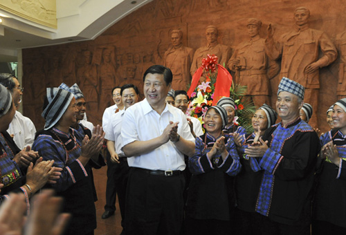 5月的广西民族大学,花团锦簇,树木成林。10日下午,习近平来到这所国家民委和广西壮族自治区共建的综合性民族高等学校。校领导介绍说,学校突出“民族性、地方性、国际性”,与多个国家互派留学生,是首批“国家外语非通用语种本科人才基地”、“海外汉语教师来华培训资助项目”执行学校。学校曾获得“党的建设和思想政治工作先进普通高校”、“民族团结进步模范单位”等称号。学校已开设7个东盟国家语种。习近平表示满意。 在“国家外语非通用语种本科人才基地”多媒体教室里,教师正在为东盟来学习的同学们讲授贺知章的《回乡偶书》和李白的《静夜思》。习近平的到来,使师生们又惊又喜,大家起立鼓掌欢迎。观摩了同学们的诗词拼接游戏后,习近平发表了热情洋溢的讲话。他说:很高兴与这么多的外国留学生交流。唐诗宋词是中国文学的精髓,学好唐诗宋词对外国留学生非常必要,也非常重要。外国留学生如果能对唐诗宋词有所掌握、领悟并加以运用,对掌握中国文化语言能力的提高就会有一个质的飞跃。希望大家利用这样一个宝贵的机会,掌握了解中国文化。希望大家学成之后成为知华友华、建立中国与东盟各国之间交往桥梁的友好使者,成为中国永远的朋友、最好的朋友! 习近平随后来到大学生活动中心,这里正在开展一场别开生面的大学生党员和入党积极分子参加的“我与祖国共成长”主题活动。同学们纷纷踊跃发言,气氛显得十分活跃,大家共同述说着自己的成长经历,倾诉着对党、对祖国的热爱之情。来自罗城仫佬族自治县的谢友进同学讲述了自己从一位贫困学子成长为一名大学生少数民族党员的艰辛历程,表示学成之后要立志建设家乡,报效祖国;来自三江侗族自治县的刘洋同学讲述了自己家乡的巨大变化、党和国家对侗乡的大力支持和帮助,自己从一名普通少数民族女孩成长为研究生的人生重大转折,她激动地用侗家山歌表示对党的民族政策的衷心拥护和感激……会场上掌声不断,笑声不断,歌声不断。 看着一张张洋溢着青春的笑脸,听着一句句感人肺腑的话语,习近平十分感动。他充分肯定了这场主题活动的作用和积极意义。他说,广西民族大学的校训是“厚德博学、和而不同”,这两句话非常精辟,涵盖很广,确实是中国哲学和智慧的精要所在。刚才几位同学说的都很好,他们求学虽然起步艰辛,但能够志存高远,倍加珍惜学习机会,立志报国,答谢党恩,我为你们的进步感到十分高兴。新中国成立以来,特别是改革开放以来,我国社会主义现代化建设取得了令世人瞩目的伟大成就,国人为之自豪。同学们要倍加勤于求学,学有所成,锻炼成才,成为社会主义事业的建设者和接班人。同学们要牢记入党为什么?就是要继承革命先烈的革命志向、理想和事业,把握中国发展的历史方位,加入到国家富强、民族振兴的伟大事业中,为中国实现现代化、为中华民族的伟大复兴而努力奋斗。我们做的每一件事情,出发点和落脚点都在于中国13亿人民的福祉。要更加坚定走中国特色社会主义道路的决心和信心,更加坚定共产主义远大理想和崇高信仰,摔打磨炼,茁壮成长。我们的国家是一个多民族的国家,中华民族是一个多民族的共同体,我们还要成为执行民族团结进步政策的楷模,为推动我们这个多民族大家庭的和谐、共同发展贡献自己的一份力量。 习近平热情洋溢的讲话,使同学们激动万分,心潮久久不能平静,大家热烈鼓掌,久久不愿离去。 5月11日上午,习近平召开自治区干部座谈会,听取了自治区党委书记郭声琨的工作汇报和桂林市、东兰县、小平阳镇的领导同志的发言。习近平充分肯定了广西经济社会发展取得的显著成绩。他说,当前广西经济快速发展,社会和谐稳定,民族团结和睦,边疆巩固安宁,人民安居乐业,干部群众精神振奋,这些成绩的取得,是在党中央的正确领导下,以声琨为班长的自治区党委和自治区人大、政府、政协几套班子,一起带领全区人民积极进取,艰苦奋斗的结果。 习近平强调,要深入实施西部大开发战略,全面提高广西经济发展水平。今后10年是深入推进西部大开发承前启后的关键时期,党中央、国务院高度重视,将专门进行部署。广西的同志要抓住机遇,认真落实中央关于深入实施西部大开发战略的政策措施,努力实现广西经济社会发展新跨越。要进一步抓好农村扶贫开发,切实加强革命老区建设。各级党委、政府要继续加大工作力度,特别要抓好边境地区、革命老区、大石山区的扶贫开发工作,确保国家扶贫开发工作重点县农民人均纯收入年均增长幅度高于全区农民人均纯收入增长的平均水平,逐步缩小城乡及农村内部收入发展差距。要认真贯彻落实党的十七届四中全会精神,进一步加强和改进新形势下党的建设。要继续以高度的政治责任感抓好十七届四中全会各项任务的落实,坚持以改革创新精神研究新情况、解决新问题、创造新经验,不断提高党的建设科学化水平。 自治区领导马飚、马铁山、陈际瓦、刘晓琨、李金早、车荣福、温卡华、陈武、石生龙、黄道伟、陈向群、余远辉、吴恒、陈章良、杨道喜、林念修、高雄、梁胜利等参加座谈会。 中央政策研究室常务副主任何毅亭,水利部部长陈雷,中央组织部副部长王秦丰,国家发展改革委副主任刘铁男陪同考察调研。 自治区党委副书记陈际瓦,自治