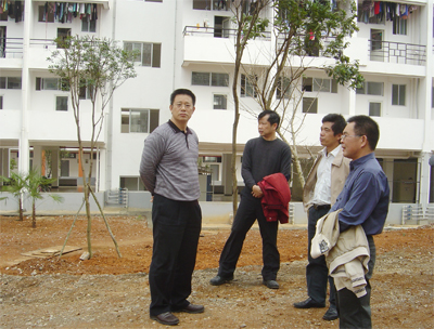 张学洪校长(左一)一行在检查学生宿舍周边绿化工作