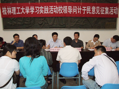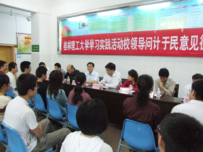 为扎实做好开展深入学习实践科学发展观活动学校领导班子深入调查研究问计于民工作,广泛征求和听取广大师生对学校建设发展的意见和建议,4月24日下午,Beat365官网开展了校领导班子“一问二请”问计于民意见征集活动(一问就是学校建设发展问计于师生;二请就是学校建设发展存在的问题请师生查找,学校建设发展的重大问题请师生参与决策)。 本次活动分别在屏风校区图书馆大厅、屏风校区材化系楼一楼大厅、屏风校区教七楼大厅、南校区食堂门口、雁山校区教四楼一楼,屏风校区21栋学生公寓前厅设六个意见征集点,学校党委书记黎志逘,校长赵艳林,党委副书记张学洪,副校长李祥清,副校长肖明贵,党委委员、校长助理华桂林率各职能部门负责人分组到各活动点向广大师生员工面对面征求学校科学发展意见和建议。学校广大师生员工踊跃地参与了这次活动,从教学、科研、人才培养、服务管理、师资队伍建设、校园安全稳定等方面为学校的科学发展积极建言献策。93岁高龄的原学校党委书记柳林同志等许多离退休老干部、老教师也来到图书馆活动点积极参与本次活动。 本次活动中征集到的意见和建议整理后将报学校学习实践活动领导小组办公室,作为学校谋划科学发展的决策依据。作为学校扎实做好开展深入学习实践科学发展观活动学校领导班子深入调查研究问计于民工作的一项重要举措,本次活动充分体现了学校领导班子紧密联系实际、紧密依靠群众领导学校科学发展、办人民满意的理工大学的决心和信心,同时,活动的成功举行也充分体现了学校广大师生员工团结一心、从我做起、推动学校科学发展、努力为办人民满意的理工大学贡献力量的良好风貌。