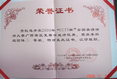 我院选手获得2008年“CCTV杯”全国英语演讲大赛广西赛区复赛特等奖