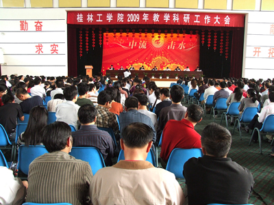 3月23日下午,我院在体育馆三楼隆重召开2009年教学科研工作大会。会议由学院党委副书记、纪委书记赵君主持,学院党委书记黎志逘,院长赵艳林,党委副书记张学洪,副院长阮百尧、肖明贵,党委委员、院长助理华桂林,院长助理陈学军、顾炳根出席会议并在主席台就座。全院教职工参加了会议。 会上,阮百尧副院长、张学洪副书记分别作了教学工作、科研工作报告,对2008年教学、科研工作进行了回顾和总结,对2009年教学、科研工作作了周密部署,肖明贵副院长宣读了学院对教学、科研工作先进集体、先进个人的表彰决定,对2008年度教学、科技工作先进集体、先进个人进行了表彰和颁奖,先进集体代表材化系系主任韦春、先进个人代表数理系系主任吴群英分别作了发言,赵艳林院长代表学院与各系院签定了教学、科研工作责任状。 阮副院长说,2008年教学工作取得一系列新的成绩,一是教学团队建设初见成效,二是课程建设佳绩频传,三是专业建设再上新台阶,四是实验室建设又获佳绩,五是教学质量稳步提高,六是教学成果奖实现历史性突破,七是两地办学顺利进行,八是教学管理更加规范。2008年学院“资源勘查工程教学团队”荣获国家级教学团队称号,实现了我院国家级教学团队零的突破;“普通化学”获得国家级精品课程,使我院国家级精品课程数量继续位居广西本科高校之首;“化学工程与工艺”专业获得第三批国家级特色专业建设点;“水污染控制实验教学示范中心”获得国家级实验教学示范中心;2008年我院申报的“05-08”年度广西教学成果奖获奖16项,其中特等奖1项、一等奖4项,名列广西本科高校前列。 张学洪副书记在报告中说,2008年,我院高级别项目稳步增长,自主创新能力不断增强,获得国家自然科学基金(7项)、国家社科基金(3项)等国家级科研项目多项。科技成果不断增多增强,科研积极性进一步提高,年内获得省部级科技奖励10多项;全年申请专利50项,授权30项。重点实验室重点学科建设步伐加快,科技基础条件更加完善。学术交流进一步活跃,科研氛围更加浓厚。科技服务进一步加快,连续两年被评为全区三对创新行动计划先进集体。 赵艳林院长在会上作了讲话,着重强调,一、坚持教学中心地位,牢固树立“质量就是生命”的办学思想。提高教育教学质量是学校树立和落实科学发展观的基本要求。对学校来讲,在加快事业发展的过程中,必须始终重视提高教育教学质量,走以内涵发展为主的办学之路,真正把树立和落实科学发展观体现在稳步提高教育教学质量上来。以质量求生存,以质量促发展,认真抓好师德建设,切实抓好教师教学水平的提高,抓紧抓好教学团队建设。二、继续抓好“质量工程”实施,稳步提高教育教学质量。要启动学院级新一轮精品课程建设工作,以课程建设带动专业建设。大力加强优质专业建设力度。大力加强已有的国家级和自治区级优质(特色)专业、精品课程、实验教学示范中心、教学团队等项目的建设工作,使其真正起到示范带动作用。认真做好国家级教学成果的申报评审工作,力争在国家教学成果评奖上获得大的突破。三、提高科研实力和水平,增强服务经济社会发展的能力。要积极组建科研团队,不断提高科研实力和水平,要面向地方和企业,促进科研成果转化。四、进一步强化教学科研管理,切实加强对教学科研工作的领导。 黎志逘书记在会上首先对全院教职工为学院取得显著成绩所作出的贡献表示衷心感谢,向荣获先进集体、先进个人的单位和个人表示热烈祝贺。黎书记同时强调指出,一要认清形势,增强教学、科研工作的责任感和紧迫感。国际金融危机仍在蔓延,就业形势十分严峻,时代对教育尤其是高等教育的要求和期望越来越高,学院面临的困难和挑战仍然不少,我们一定要认清形势,从实际出发,要靠自己的力量,真心实意,聚精会神,扎扎实实抓好学院的教学、科研工作。二要抓关键、抓重点,全力抓好教学、科研工作。要牢固树立教学工作的中心地位,全力推进教学质量工程建设,切实抓好教学、科研团队的建设,全面落实好师资队伍建设的任务和要求。三要进一步制定和完善各项措施,为教学、科研工作创造良好的政策环境。
