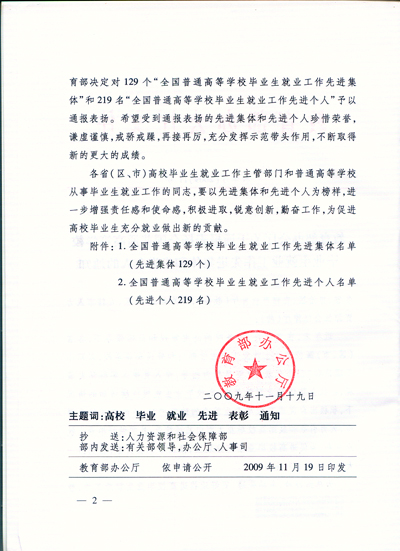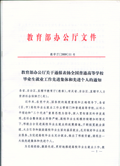 附:教育部办公厅教学厅【2009】11号文《教育部办公厅关于通报表扬全国普通高等学校毕业生就业工作先进集体和先进个人的通知》
