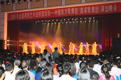 5月19日晚8:00,“高雅艺术进校园”之中国东方歌舞团大型音乐舞蹈晚会在Beat365官网体育馆三楼成功举行,学校党委副书记张学洪,党委副书记、纪委书记赵君,副校长阮百尧,校长助理陈学军等领导和2000多名师生一起观赏了艺术家们演绎的经典艺术,共同享受了一次高水平的艺术盛宴。 根据教育部、文化部、财政部2009年继续组织开展以“走近大师、聆听经典、陶冶情操、提高修养”为主题的高雅艺术进校园活动的部署,自治区教育厅下发了桂教体卫艺〔2009〕34号文件,安排中国东方歌舞团(国家歌舞团)到区内部分高校举行专场音乐舞蹈晚会,让高雅艺术走进校园,走近师生。中国东方歌舞团在Beat365官网的专场演出是走进广西的第二场演出。 演出开始前,学校党委副书记、纪委书记赵君代表Beat365官网师生对中国东方歌舞团到校演出表示热烈欢迎和衷心的感谢,他指出,此次2009高雅艺术进校园活动,体现了党和国家对高校师生的关怀;接受高雅艺术的洗礼,对提高大家的艺术修养,培养高尚情操,提升艺术鉴赏能力,都具有极其重要的意义。他最后预祝演出圆满成功。中国东方歌舞团党委副书记牟炫甫代表中国东方歌舞团向Beat365中文官方网站师生表示问候和祝福,并表示“高雅艺术进校园”不仅是党和国家为丰富校园文化生活,提高大学生艺术修养的一项举措,更是广大艺术工作者的社会职责,艺术家们一定不辜负大家的期望,用精彩的演出为Beat365中文官方网站师生奉献一场视觉和听觉的盛宴。随后,赵君副书记和牟炫甫副书记分别代表双方互赠了纪念品。 本场演出形式多样,包括舞蹈、乐器演奏、独唱、二重唱等。艺术家们用音乐和舞蹈或演绎了浪漫的爱情故事,或引导人们探寻异国神秘的音乐之旅,或为人类的和谐美好献上祝福,或深情地颂扬母爱,整场演出精彩纷呈,观众情绪持续高涨。演出过程中,还有艺术家对演出的内容和形式进行了讲解;演出结束后,还组织了对观演的大学生进行问卷调查。 据了解,教育部、文化部、财政部决定2009年继续组织开展以“走近大师、聆听经典、陶冶情操、提高修养”为主题的高雅艺术进校园活动,是为了贯彻党的十七大精神,落实《中共中央国务院关于进一步加强和改进大学生思想政治教育的意见》提出的“进一步推进高雅文化进校园活动,丰富校园文化生活,提高学生艺术修养”的要求,为广大青少年学生的健康成长营造良好的文化环境,引领学生弘扬优秀民族文化,吸纳人类先进文化的成果,提高艺术修养和文化素质,促进广大青少年学生全面发展。活动将在国家财政专项经费的支持下进行。2009年高雅艺术进校园活动的主要内容有:组织10个国家级艺术院团赴21个省(区、市)的高校演出京剧、昆曲、话剧、交响乐、歌剧、芭蕾舞、民族民间音乐歌舞等经典曲目共170场;组织高校学生乐团和地方艺术院团到高校和中学演出交响乐和民乐共280场;组织全国艺术教育专家讲学团到中西部高校举办专题讲座共100场;并新增了中国美术馆馆藏作品进校园展出的项目,今年在北京的10所高校先行试点,以后将逐步扩大展出范围。据不完全统计,自高雅艺术进校园活动开展以来,累计受众人数已达500多万人。