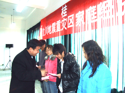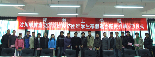 1月15日上午, 学院为汶川地震重灾区家庭经济困难学生发放了寒假返乡补助。 发放仪式在雁山校区4301会议室举行。学院党委副书记、纪委书记赵君,院长助理陈学军以及相关系(院)负责老师、全体获资助学生参加了发放仪式,学生工作部(处)熊英部(处)长主持仪式。 赵君副书记在仪式上发表了讲话。他指出,长期以来,学院一直高度重视对家庭经济困难学生的教育服务工作,通过多年努力,已构建了“奖、贷、勤、助、减、免、缓、补”的助学体系,为家庭经济困难学生顺利完成学业提供了有力保障;汶川特大地震发生后,学院高度重视,在短时间内拨出专款,共为107名四川籍学生发放生活补助9.85万元。2008年秋季学期,学院又按照上级部门要求,把来自汶川地震重灾区的家庭经济困难学生全部纳入国家助学政策体系,并为全院34名地震重灾区同学减免学费17.45万元,发放助学金和生活补贴8万多元。为了帮助汶川地震重灾区家庭经济困难学生度过一个祥和的春节和寒假,学院又特别安排部分资金作为困难学生的返乡路费补助。赵君副书记希望受资助的同学要自信、自强,正确面对家庭的暂时困难,珍惜国家、社会、学校对贫困学生的关爱,全面提升自身素质,增强社会竞争力,在时代和社会发展进步中汲取营养,诚信、自律、感恩、奋进,争做自强不息、勇于挑战的坚强人,敢于创新、适应时代的有用人,加强修养、回报社会的有心人。 旅游管理(应用)08-2班张贵科(四川绵竹籍学生)代表受资助学生发言,感谢学院一直以来的资助和亲切关爱,使他们在解决经济困难的同时也增强了好好学习的动力,并表示一定会坚强勇敢、懂得感激与回报,发扬“桂工精神”,在校学好专业,回到家乡身体力行参与重建,建设美好家园。 赵君副书记、陈学军助理为获得资助的同学发放了寒假返乡补助。