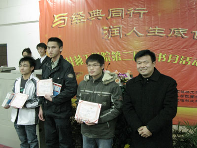 日前,由图书馆、团委共同主办、学生社团工委、社团联承办的学院第二届读书月闭幕式暨颁奖典礼在雁山校区05102教室隆重举行。学院党委副书记、纪委书记赵君出席闭幕式并讲话,图书馆、团委领导出席闭幕式暨颁奖典礼。 本届读书月以“与经典同行,润人生底色”为主题,历时2个月,旨在培养学生“爱读书、会读书、读好书”的良好习惯,开拓学生视野,丰富学生知识,使学生在读书中成长,不断提高人文修养及自身综合素质,提高校园文化活动品味和格调,构建特色校园文化。 闭幕式上,承办单位代表凌日飞同学做了活动总结,播放了读书月活动宣传片,公布了同学们心目中最喜爱的十部经典名著、经典影片,为优秀读者、活动先进个人、征文比赛、自制书签征集比赛获奖同学颁发了荣誉证书。 赵副书记在讲话中指出:对于人的成长成才,教育是外在因素,自身努力是内在因素,社会实践则是基石。因此,同学们要成长成才,就必须向实践学习,通过实践增长知识和本领。他强调:对于大学生来说,自我教育更加重要,而读书就是实现自我教育的捷径之一,参与读书月活动就是向实践学习的有效途径。他要求有关部门要把读书月活动坚持开展下去,不断丰富活动内容,创新活动形式,使这项活动真正成为广大同学乐于参与、能够受益的校园文化品牌活动。同时,他希望越来越多的学生积极参与到活动中来,多读书,有选择的读书,读好书,养成读书的好习惯,不断积累知识、升华品格,滋润人生底色,树立终身学习的观念。