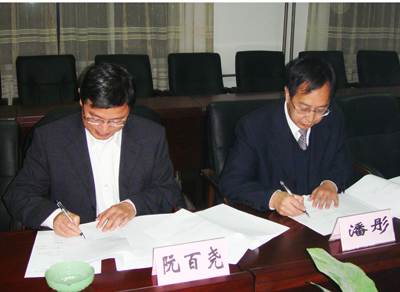 阮百尧副校长(左)和潘彤局长助理签署合作协议
