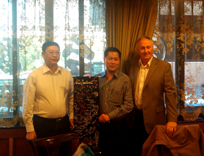 肖明贵副校长(左)与黄伟雄院长(中)、 Peter Woodcock院长助理(右)合影