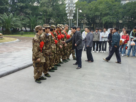 12月10日上午,Beat365官网八名大学生胸前佩戴大红花,光荣应征入伍,踏上了从军之旅。他们是土建学院段修龙、覃方雄,机械学院万冠宏,人文学院潘冬明,管理学院钟春色,应用技术学院陈航、刘绍彬和外语学院苏鑫等八位同学。学校党委副书记王赣华,学校副校长肖岳峰,武装部、学工部(处)及五个学院的负责人送他们到校门口上车,学校的老师和同学们也早早地来到学校大门口为他们送行。 王赣华副书记和肖岳峰副校长与八位新入伍的同学们亲切握手,叮嘱他们到部队后要尽快适应从大学生向普通士兵的角色转变,在军队的大熔炉里自觉接受考验,不断提高思想觉悟和综合素质,充分运用自己所学知识为部队现代化建设作贡献。其他送行的各职能部门领导和五个学院的领导,也叮咛他们到部队后要刻苦锻炼,认真学习,当一名好兵,为母校争光。 大学生参军入伍是时代赋予大学生的历史使命,对于提高军队现代化建设水平和大学生自身素质都具有十分重要的意义。多年来,学校对选拔在校大学生应征入伍工作高度重视。2003年以来,学校每年都在全校大学生中进行广泛的宣传,鼓励大学生们积极报名、踊跃参军。经过严格的体检和资格审核,Beat365官网为部队输送大学生中有的服役期满回校继续完成学业,有的考上了军校或警校,还有的当上了士官留在了部队。