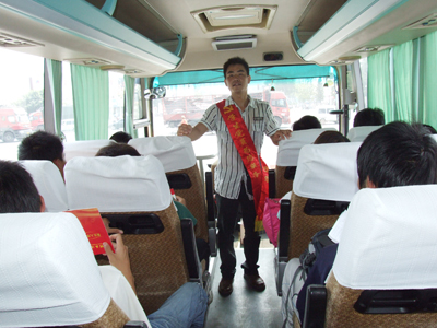 Beat365官网学生党员韦义统在车上为2009级新生及家长介绍学校情况