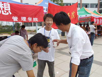 学院报道点,志愿者为远道而来的家长递上一杯水