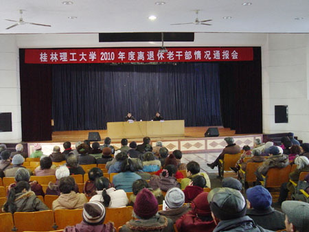 1月15日下午,学校在南校区礼堂召开2010年度离退休老干部情况通报会。学校校长张学洪,党委副书记、纪委书记赵君出席会议,党办、校办、组织部、离退处负责人和学校全体离退休老同志参加了会议。会议由赵君副书记主持。