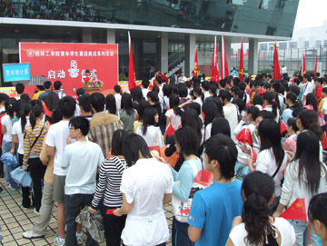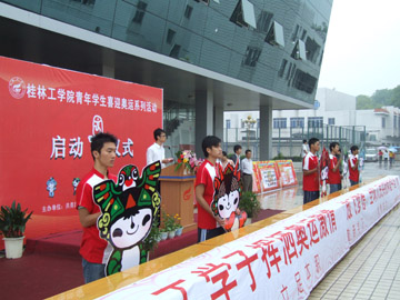 4月30日上午,由学院团委、学生会组织开展的桂工青年学子喜迎奥运倒计时100天系列活动启动仪式在学院体育馆前隆重举行。学院党委委员、院长助理、人事处处长华桂林、学院党委宣传部副部长钟克庆、学院党委学生工作部副部长叶昊、学院团委副书记李辉以及各系(院)分团委书记出席了启动仪式,启动仪式由学院团委书记辛立章主持。 启动仪式上,北京奥运会广西火炬手、我院外语系赵晓丽同学作了发言,表达了广大同学对奥运的关注、支持和迎接奥运的热情。院学生会主席周智华同学向全院同学发出了“心系奥运、情系中华、奋发成才、报效祖国”的倡议,号召广大同学把“迎接奥运从讲文明做起,参与奥运从身边做起,奉献奥运从现在做起”落实到校园生活的每一个角落,诚实守信,做道德规范的实践者;团结友爱,做校园文明的倡议者;言行得体,做公务礼仪的引导者;爱校爱家,做“绿色”环境的建设者;参与奉献,做文化交流的宣传者。 学院党委委员、院长助理、人事处华桂林处长在启动仪式上发表了讲话。他强调:从中国申奥成功到奥运会即将到来,我们伟大的祖国在机遇与挑战并存的国际环境下正大踏步的向前迈进,在奥运会倒计时100天这个具有特殊意义的日子里,祖国人民与全世界各族同胞一起喜迎奥运,共同期盼奥运。面对即将来临的奥运会,青年朋友们肩负着历史的重任和新时代赋予的使命,广大学子们要按照胡锦涛总书记提出的勤于学习、善于创造、甘于奉献的要求,以时不我待的精神奋发进取,充分发挥生力军的作用,为实现“新北京、新奥运”战略构想而努力奋斗。同时,他希望广大青年学生,要弘扬时代精神、倡导社会新风;要弘扬科学精神,立志健康成才;要理性爱国,立足本职,努力学习,发奋成才;要以“迎奥运、讲文明、树新风”热潮为契机,塑造大学生文明形象,建设和谐校园。 华桂林委员的讲话引起了启动仪式现场同学们的强烈反响,大家一起挥动手中五星红旗,为2008北京奥运加油喝彩。 启动仪式结束后,同学们观看了设在体育馆前的奥运知识图片展览,并纷纷在印有“放飞梦想,全球人民共祝中国和谐;顽强拼搏,桂工学子挥洒奥运激情”字样的横幅上签名,表达对奥运的殷切期盼和深深祝福。 据悉,院团委和学生会除了举办以上“桂工学子签名祝福奥运”和“奥运知识图片展”活动之外,还举办“奥运精神英语征文比赛”、“人文奥运主题公园”、“喜迎奥运乒乓球赛”和“品味奥运艺术、演绎精彩人生”奥运知识竞赛等活动。