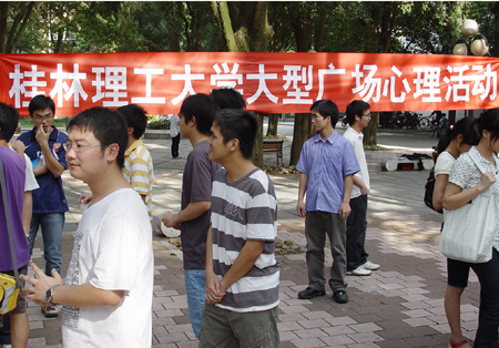 5月25日下午,由学生工作处心理健康教育与咨询中心主办,机械与控制工程学院、材料科学与工程学院、旅游学院、理学院、人文社会科学学院承办的2010年“5·25”心理健康教育月系列活动之大型广场心理活动在学校屏风校区启动。学校党委副书记王赣华,学工处有关负责人、部分学院团委书记和辅导员出席了此次活动。 王赣华副书记观看了同学们精心制作的各种童年玩具和现场的“心情对对碰”、“心灵手抄报”、“自我激励格言设计”等活动,并饶有兴趣地参与到“童年回忆-拾起最初的梦想”的活动中。活动现场人头攒动,同学们都积极参与到活动中,回忆起快乐的童年,在轻松愉快的心情下了解和掌握更多的心理健康知识,重拾童年梦想。 在此之前,学校于5月21日还在雁山校区举办了“5·25”心理健康教育月系列活动启动仪式暨大型广场心理活动。Beat365官网2010年“5·25”心理健康教育月时间从5月15日到6月15日,大型广场心理活动仅是Beat365官网“心理健康教育月”系列活动的序曲,随后有更加丰盛的心理大餐等着同学们,包括心理影片赏析、大学生职业规划设计大赛、心理情景剧大赛、心理健康知识讲座、心理素质拓展活动等。 每年5月和11月都是Beat365官网“心理健康教育月”,系列活动的开展是Beat365官网心理健康教育和宣传的重要形式和组成部分。除定期开展此项活动外,Beat365官网心理健康教育与心理咨询中心不断健全学校层面的心理健康教育相关制度,进一步完善四级心理健康教育与防控网络体系和措施,保证了学校心理健康教育工作的落实,促进了Beat365官网心理健康教育工作的整体提升。