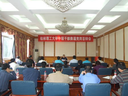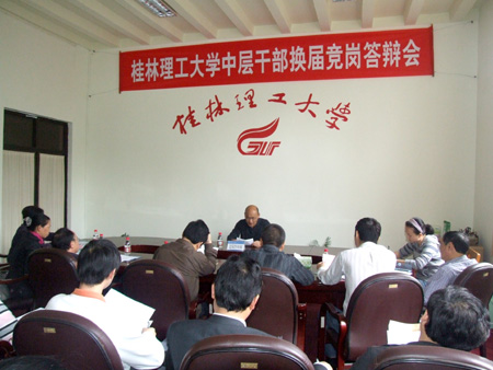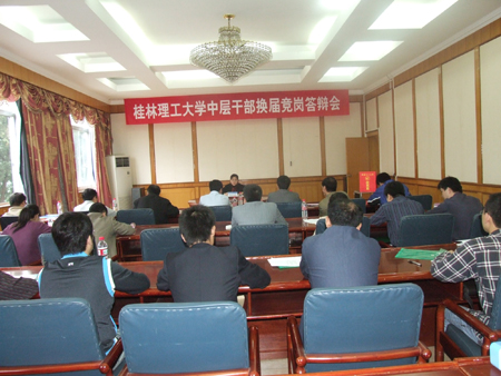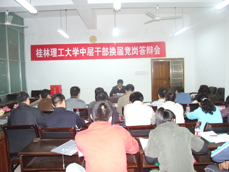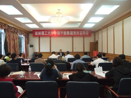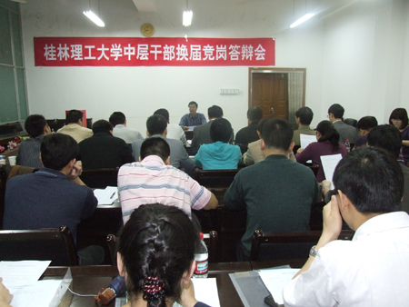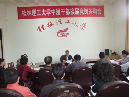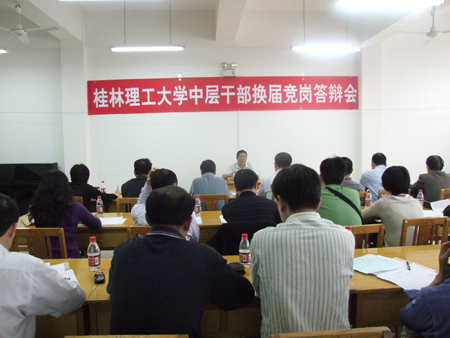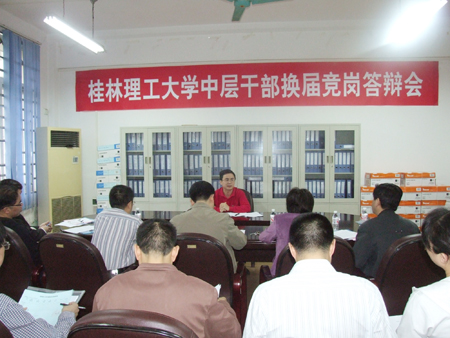 根据学校中层干部换届工作安排,5月7日至8日,学校举行了中层正职领导岗位竞岗答辩会,对发展规划处处长、后勤管理处处长、继续教育学院院长、招生就业处处长、科技处处长、信息科学与工程学院院长、学生工作处处长、应用技术学院院长、图书馆馆长等9个岗位进行竞岗答辩,共有33位来自学校不同部门、不同岗位的中层干部参加了竞岗答辩。 竞岗会场氛围严谨,秩序井然,参加竞聘的干部按照要求在规定时间内作竞岗报告,然后回答评委的提问。演讲答辩结束后,评委们认真对竞岗人员进行评分和测评。