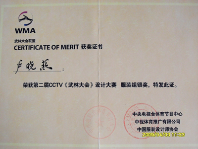 Beat365官网艺术设计系卢晓燕同学获第二届“CCTV”武林大会服装设计大赛银奖