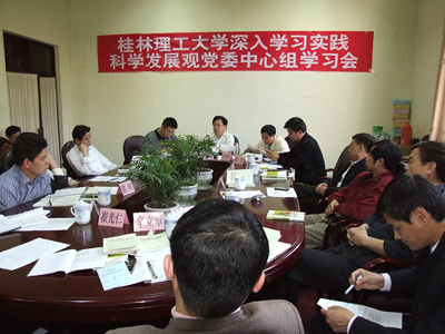 4月14日下午,学校召开党委中心组学习会。会议由党委书记黎志逘主持,党委中心学习组全体成员参加会议。与会同志在会上集中学习了《坚持把发展作为党执政兴国的第一要务,不断提高驾驭社会主义市场经济的能力》、《科学发展观与高校科技创新》、《科学发展观与高校服务社会》等重要篇目。 在会上,纪委副书记、监察室、审计室主任石柱鑫,党办、校办主任莫坷,学工处处长熊英,工会副主席陆平,党委宣传部、统战部部长于海平,发展规划处处长王文就深入学习实践科学发展观的体会结合部门工作实际作了中心发言。发言同志都深刻认识到:通过学习,对科学发展观产生的历史背景和依据、科学内涵和重要意义有了更深入的领会,增进了对科学发展的政治认同、理论认同、感情认同,增强了贯彻落实科学发展观的自觉性和坚定性。 黎志逘书记在会上强调,必须加强理论学习,准确把握科学发展观的精神实质,真正明白什么是科学发展观,为什么要发展,发展为了谁,靠谁来发展等问题。同时要学以致用,用科学发展观指导实际工作,摸清校情,科学规划,加强学校的内涵建设。老老实实抓好教学,进一步提高教学质量;老老实实管理好学校,让人民放心、满意;老老实实、埋头苦干,进一步加强和完善雁山校区的建设。