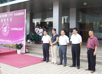 7月11日上午,由院团委组织、以“科学发展新农村、青春唱响北部湾”为主题的学院2008年暑期“三下乡”社会实践活动启动仪式在体育馆前举行。出席启动仪式的领导和老师有学院党委委员、院长助理、人事处处长华桂林,学院党委办公室、院长办公室主任莫坷,学院党委学工部部长、学生工作处处长熊英,学院党委宣传部、统战部副部长钟克庆,学院团委书记辛立章以及各系院分团委书记;各社会实践团队的同学们参加了启动仪式。仪式由学院团委副书记李辉主持。 学院团委书记辛立章从活动主题、总体要求、主题活动等方面介绍了学院2008年社会实践活动的总体部署和安排。学生志愿者代表官红艳同学、社会实践指导教师代表周国桥老师先后作了发言。会上,还举行了授旗仪式,与会领导为各社会实践团队授旗。 学院党委委员、院长助理、人事处处长华桂林在会上对本次社会实践活动提出了希望和要求:一要牢固树立“安全第一”的思想,确保师生安全;二要紧扣实践活动的主题,扎实开展工作,确保活动取得实效;三要在实践活动中以实际行动进一步践行社会主义荣辱观;四要吃苦耐劳,善于思考,通过实践活动进一步提高素质。