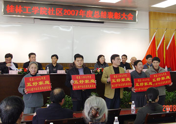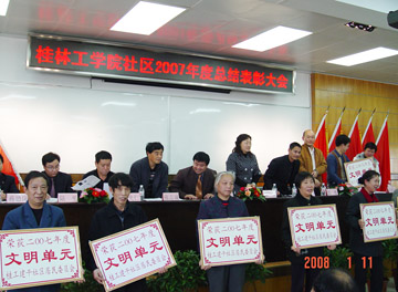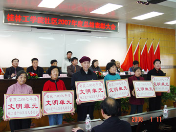 1月11日下午,学院在党校教室召开“桂林工学院社区2007年度总结表彰大会”,对2007年“文明楼栋”、“文明单元”、“五好家庭”进行了颁奖。会议由学院工会副主席陆平主持,学院党委副书记、院工会主席赵君出席会议并讲话,院办、宣传部、工会、保卫处、综合管理处、后勤集团负责人,东江街道办事处领导,各楼栋长,五好家庭户等参加了会议。 在会上,学院社区办公室主任周政萍总结了社区2007年工作情况。学院宣传部、统战部部长于海平宣读了表彰2007年 “文明楼栋”、“文明单元”、“五好家庭”的决定。获奖代表作了经验介绍发言。东江街道办事处书记张钧在讲话中充分肯定了我院社区在灵活多样的创建活动中取得了良好效果,并相信在全社区居民的热情参与下,2008年我院社区工作一定会再上一个新的台阶。 赵君副书记对获得表彰的“文明楼栋”、“文明单元”、“五好家庭”表示热烈祝贺,希望受表彰的单位和个人再接再厉,争取在以后的工作中取得更大的成绩。并就如何做好社区工作作了指示,一要充分认识社区工作的重要意义,增强做好社区工作的责任感和使命感;二要突出工作重点,狠抓日常工作落实;三要切实加强社区干部队伍建设,不断提高自身素质。