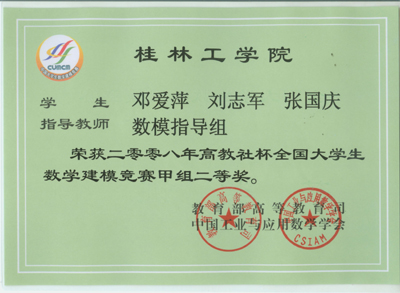 近日,2008“高教社杯”全国大学生数学建模竞赛结果揭晓,我院以荣获国家一等奖1个,二等奖4个,广西赛区一等奖5个、二等奖12个、三等奖6个的优异成绩名列广西前茅。同时,我院获得“2005——2008年全国数学建模竞赛广西赛区优秀组织学校”荣誉称号。数理系林亮教授获得“全国数学建模竞赛广西赛区优秀组织工作者”荣誉称号,数理系刘筱萍、蒋远营两位老师获得“全国数学建模竞赛广西赛区优秀指导教师”荣誉称号。 我院一直非常重视数学建模竞赛活动,近年来学院结合专业特点,大力开展学生专业技能竞赛活动,为学生提供了一个学以致用的平台,调动了学生专业学习的兴趣,提高了学生的专业素养、创新能力和职业竞争力。为更好的参加该项赛事,学院开设了数学建模公共选修课,精心安排数理系骨干教师对学生进行指导和培训。近四年来,我院共组织了77个队参赛,获得全国一等奖4个,二等奖14个,各级获奖63个队,获奖率82%,名列广西首位。 在学院教务处、学院团委等有关单位的大力支持下,数理系制定了《2008年全国大学生数学建模竞赛参赛方案》,数学建模指导小组对参赛小组进行了精心培训,指导老师不惜放弃暑假休息时间培训参赛队员。我院大学生在比赛中迎难而上,展现勇于拼搏、团结合作的良好精神风貌,并交出了一份优异的答卷,为学校争得了荣誉。