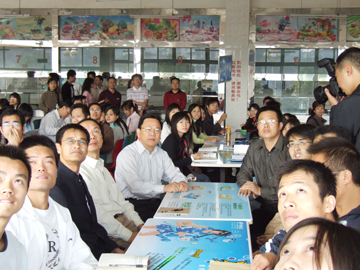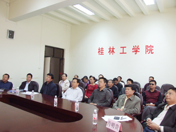 在第二会议室收看十七大的领导和老师。前排就座的领导为(左起):华桂林、阮百尧、赵君、黎志逘、张学洪、李祥清、肖明贵