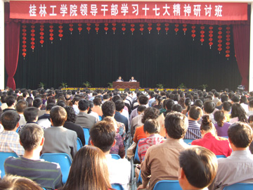 为了更好地学习、宣传、贯彻党的十七大精神,学院党委定于11月15 日至19 日举办领导干部学习十七大精神研讨班。研讨班将组织全体领导干部认真学习胡锦涛同志在中国共产党第十七次全国代表大会上的报告和十七大有关文件,并要求结合十七大精神的学习,研究讨论如何进一步推动学院的建设与发展。 11月15日下午4:30,学院领导干部学习十七大精神研讨班开班典礼在体育馆三楼举行。院领导与全体副处以上领导干部和教学教辅人员、管理干部、学生代表二千五百多人参加了开班典礼。开班典礼由党委副书记、院长赵艳林主持,党委书记黎志逘对学院学习宣传贯彻十七大精神工作做了重要指示。 黎志逘书记在讲话中对推动学院广大师生深入学习贯彻党的十七大精神提出了几点意见: 一、充分认识学习宣传贯彻党的十七大精神的重大意义,不断增强学习贯彻十七大精神的紧迫感、责任感、使命感。黎书记指出,党的十七大是在我国改革发展关键阶段召开的一次十分重要的大会。这次大会高举旗帜、继往开来、求真务实,是一次团结的大会、胜利的大会、奋进的大会。认真学习宣传贯彻党的十七大精神,关系党和国家工作全局,关系中国特色社会主义事业长远发展,对于动员全党全国各族人民,在以胡锦涛同志为总书记的党中央领导下,高举中国特色社会主义伟大旗帜,抓住和用好重要战略机遇期,推动党和国家事业向前发展,奋力夺取全国建设小康社会新胜利、开创中国特色社会主义事业新局面,具有重大的现实意义和深远的历史意义。我们一定要从党和国家工作全局出发,从中国特色社会主义事业长远发展出发,按照中央和自治区的有关安排,紧密结合学院的实际,组织师生员工切实把党的十七大精神学习好、宣传好、贯彻好,不断加快学院建设发展步伐,为推动学院又好又快发展、为实现党的十七大确定的奋斗目标和工作任务而不懈奋斗。 二、全面准确学习领会党的十七大精神,把全院师生员工的思想和行动统一到党的十七大精神上来。 三、坚持用党的十七大精神武装头脑、指导实践、推动工作,在学院迅速掀起学习贯彻党的十七大精神的热潮。对于学院学习贯彻党的十七大精神,黎书记特别强调要坚持学以致用、用以促学,把用党的十七大精神武装头脑、指导实践、推动工作作为学习的出发点和落脚点,在学院迅速掀起学习贯彻党的十七大精神的热潮,真正把学习成果转化为加快学院建设发展的实际行动,转化为学院改革发展的实际成果。因此他要求全体领导干部:1、要认真研读党的十七大文件,原原本本学习党的十七大报告和党章;2、要紧密联系实际,推动学院各项事业发展;3、要加强宣传普及和理论研究,营造良好氛围;4、要周密安排,切实加强组织领导。 最后,黎书记满怀激情地号召大家高举中国特色社会主义伟大旗帜,更加紧密地团结在以胡锦涛同志为总书记的党中央周围,万众一心,开拓奋进,为进一步推动学院的改革发展,为夺取全面建设小康社会的新胜利、开创中国特色社会主义的新局面、谱写人民美好生活的新篇章而努力奋斗。 开班仪式后,全体领导干部将按照学院的部署,通过听辅导报告、自学研读、分组讨论等方式,认真学习十七大文件和报告,联系学院实际进行深入研讨。