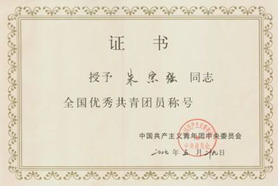 我院朱宗强同学获得全国优秀共青团员荣誉称号