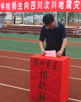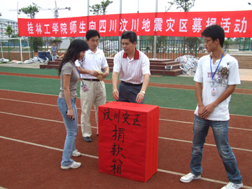 四川汶川县发生大地震以来,受灾地区人民的状况时时牵动着学院全体师生员工的心。继5月14日下午屏风校区师生员工举行“为国分忧,为灾区人民奉献爱心”的大型募捐活动之后,5月15日早7点,雁山校区师生员工紧接着又举行了为汶川灾区人民募捐的活动。学院党委副书记、纪委书记赵君在募捐活动仪式上发表讲话,学院党(院)办主任莫坷主持募捐活动仪式。
