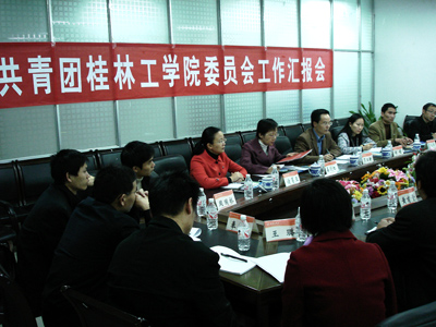2007年12月12日上午,共青团广西区委罗日新副书记在共青团广西区委学校部郑娟部长、权益部姜剑虹部长、共青团桂林市委诸葛亚副书记、学校部韩永华副部长陪同下来我院检查指导共青团工作。学院党委张学洪副书记出席汇报会,我院全体专职团干部参加了汇报会。张学洪副书记对共青团广西区委一直以来对我院共青团工作的大力支持表示感谢,并就学院的建设与发展、近年来学院取得的突出成绩、学院的“两申”等工作向客人做了详细介绍。