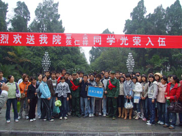 12月10日上午,我院土木系覃含、张仁祥两位同学身穿绿色军装,胸前佩着大红花,光荣应征入伍,踏上从军之旅。学院党委副书记张学洪,学院党委委员、院长助理、人事处处长华桂林,党(院)办、学工部(处)、武装部、土木系领导送他们到校门口上车,土木系同学和两位应征入伍同学的家长也早早地来到学院大门口为他们送行。 张学洪副书记与两位同学亲切握手,并叮嘱他们到部队后要尽快适应从大学生向普通士兵的角色转变,在军队的大熔炉里自觉接受考验,不断提高思想觉悟和综合素质,充分运用自己所学知识为部队现代化建设作出自己的贡献。其他送行的各职能部门领导和土木系领导,也叮咛他们到部队后要刻苦锻炼,认真学习,当一名好兵,为母校争光。 大学生参军入伍是时代赋予大学生的历史使命,对于提高军队现代化建设水平和大学生自身素质都具有十分重要的意义。多年来,学院对选拔在校大学生应征入伍工作高度重视。2003年以来,学院每年都在全校大学生中进行广泛的宣传,鼓励大学生们积极报名、踊跃参军。经过严格的体检和资格审核,截止今年,我院已经为部队输送了19名大学生,他们中有的服役期满回校继续完成学业,有的考上了军校或警校,还有的当上了士官留在了部队。