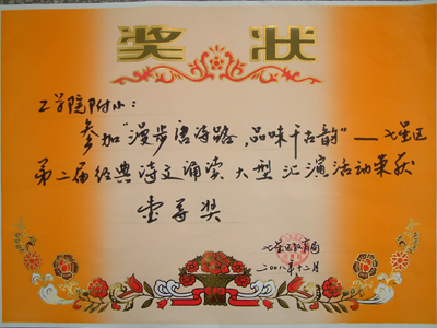 12月4日至6日,中国教育学会重点课题“诵读经典诗文,提高学生的人文素养及语文素养”、教育部重点课题“中华传统文化经典诵读及其课程化研究”第四届课题研究观摩研讨活动在广西首府南宁举行。中国关心下一代工作委员会中华传统文化诵读工程蔡恒奇秘书长给2007年度全国经典诵读优秀学校、优秀课题组颁发证书和授牌。我院附小因积极组织,认真策划,深入研究,成效显著,获得“全国经典诵读优秀学校”荣誉称号。我院附小课题组撰写的中期课题研究实验报告被评为“全国优秀实验报告”,朱雪豫、谢培老师被评为“中华经典诵读全国优秀指导员”,陈立新老师被评为总课题组“经典诵读优秀教师”,赵阳天、李彦哲、刘依润同学被评为“全国百佳国学少年”。 另悉,在12月10日举行的“漫步唐诗路,品味千古韵”——七星区第二届经典诗文诵读大型汇演活动中, 我院附小参赛节目“凝神水声舟影间”以独具创意的构思、精彩的表演获得一等奖,同时荣获参赛的21所学校中唯一的“最佳创意奖”。