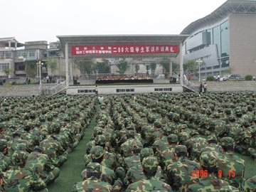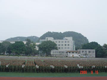 9月15日下午4点,伴随着微微的秋风,校田径场上迎来了一批朝气蓬勃,英姿飒爽的桂工新人。06级新生军训开训典礼在这里隆重举行。校领导赵艳林、李祥清、周德俭、肖明贵以及武警桂林市支队副支队长吴登培中校以及有关院、系、部、处的领导出席了本次大会并在主席台就坐。本次大会由学院武装部部长崔光仁主持。 首先进行的是军训团各级领导的任命。由学院军训领导小组组长李祥清副院长宣读军训团领导任命书,任命武警桂林市支队副支队长吴登培中校为军训团团长,桂林工学院武装部部长崔光仁为军训团政委,武警桂林市支队大队长邱诗荣为军训团参谋长。今年的军训团队阵营强大,由来自学院本部和学院博文管理学院的本专科新生3512名组成,本届军训团共有4个营33个连。 在开训典礼上,军训领导小组组长李祥清副院长作了军训动员报告。他指出,我院作为全国大学生军训试点单位之一,今年已经是第19期了。他要求每一位参训学员都要具备坚强的毅力,吃苦的精神,克服困难,战胜自我,同时要严守纪律、注意安全,争取在9月27日的军训汇报阅兵中,以优异的成绩接受各级领导的检阅。随后,军训团团长、武警桂林市支队副支队长吴登培中校和军训团新生代表崔彦彦先后作了发言。 赵艳林院长在讲话中希望本次军训一要做到严格要求,严格训练;二要达到磨练意志,提高思想,增强纪律,强壮身体的目的。 最后,典礼在雄壮的军歌声中结束。